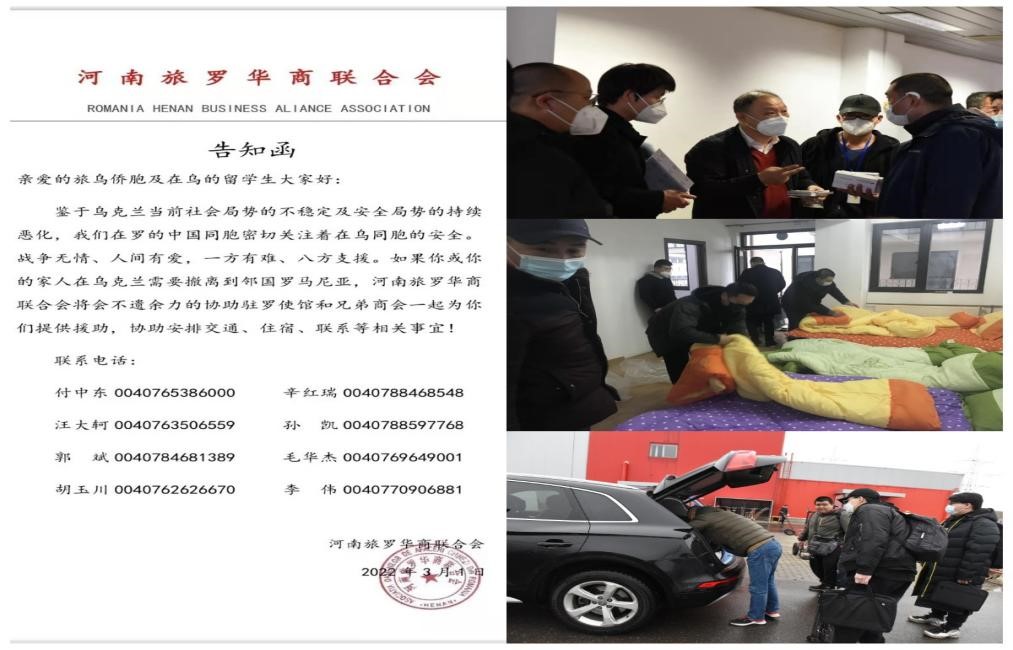 俄乌冲突发生后,河南省侨联及乌周边国家侨团高度关注旅乌海外侨胞、留学生的冷暖安危。2月28日,在得知撤侨中转罗马尼亚的消息后,河南旅罗华商联合会第一时间与省侨联取得联系,在中国驻罗马尼亚大使馆的指导下,连夜成立“援助小组”,自发投入各类车辆10余辆、组织动员侨胞志愿者近50人,不辞辛苦、任劳任怨,扎实做好在乌侨胞和留学生安置保障工作,展现了海外赤子拳拳爱国之志、殷殷爱国之心。