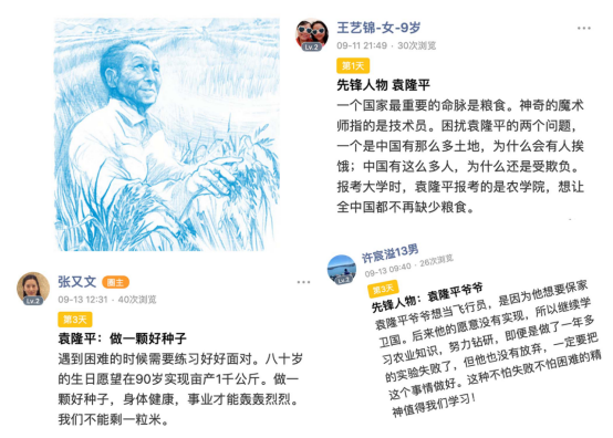 春种秋收,春华秋实。营员们在稻香满穗的时节学习先锋人物袁隆平的故事,更加感受到袁隆平院士执着科研的攻坚克难精神和心怀“禾下乘凉梦”的毕生追求初心。