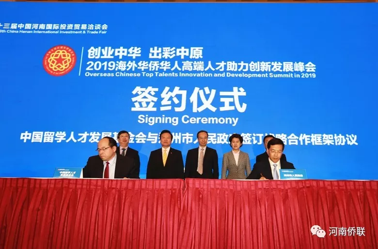 活动现场,中国侨商联合会、河南省归国华侨联合会、郑州市人民政府签订战略合作框架协议,中国留学人才发展基金会分别与郑州市人民政府、郑州大学签订战略合作框架协议,合作方将共同搭建高端人才发展平台,推动中原更加出彩。
