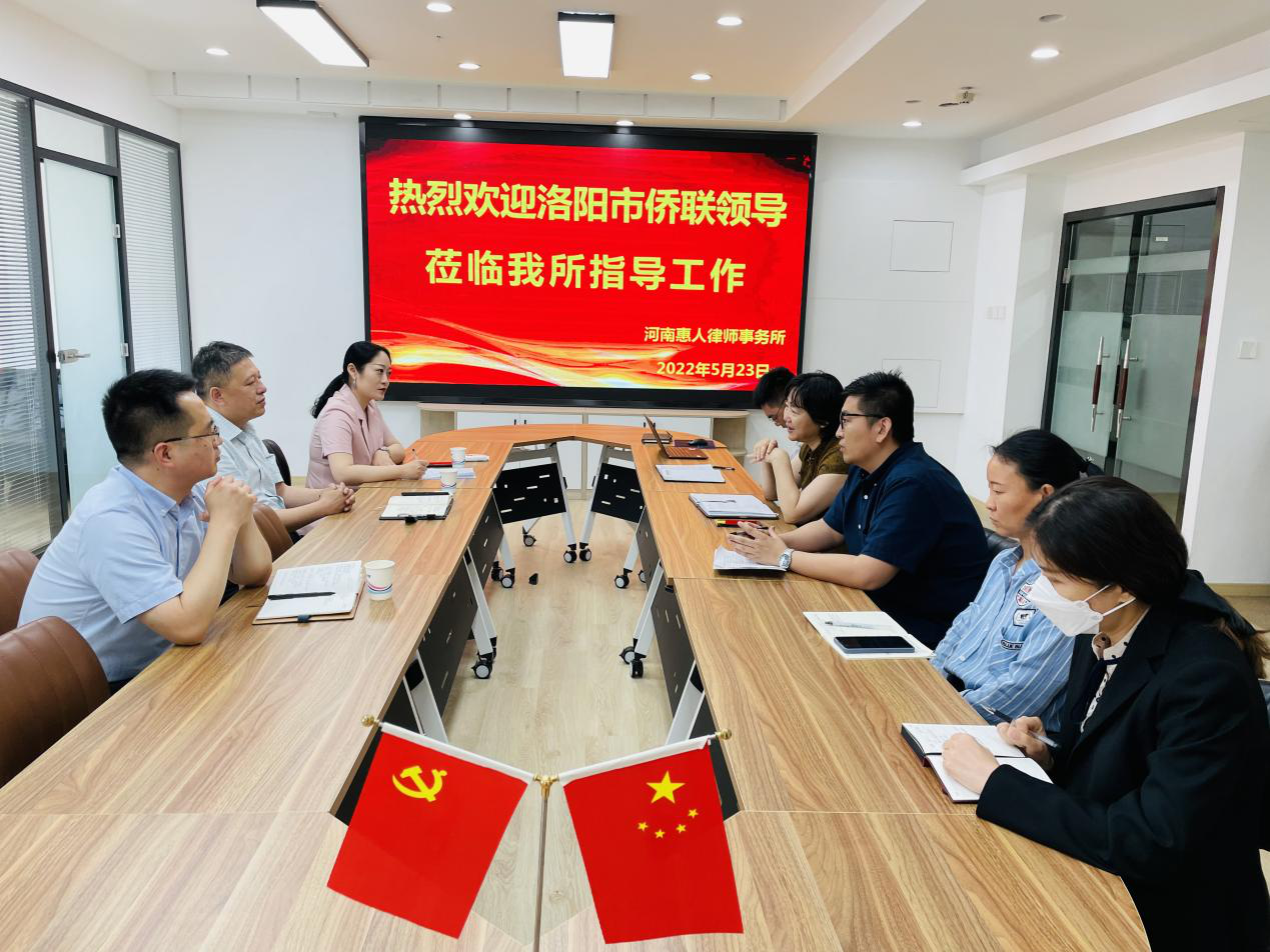 5月23日下午,洛阳市侨联副主席杨晓冬、秘书长刘涛、侨商会常务副秘书长周佳一行到河南惠人律师事务所走访调研,并围绕组建市侨联“八五”普法志愿服务队工作召开座谈会。市侨商会副会长、市侨商会法律顾问、惠人所主任曹元遇,惠人所党支部书记吴涛、执行主任王博以及部分律师参加本次调研。