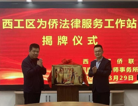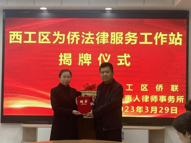 3月29日上午,西工区为侨法律服务工作站在河南惠人律师事务所揭牌成立。西工区委统战部常务副部长申会武和河南惠人律师事务所执行主任曹南共同为工作站揭牌。