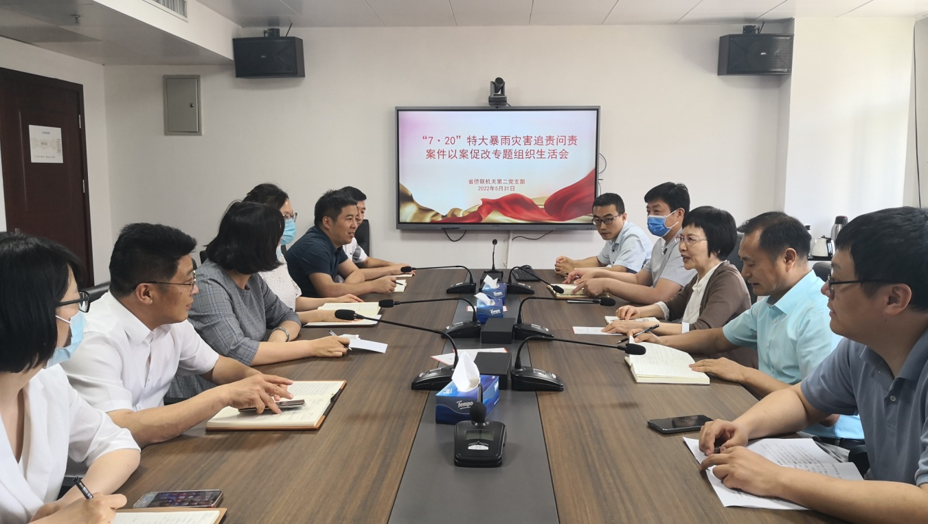 5月31日上午,省侨联机关第二党支部召开“7·20”特大暴雨灾害追责问责案件以案促改专题组织生活会,省侨联党组成员、副主席、机关党委书记王月以普通党员身份参会,会议由支部书记牛海堂主持。